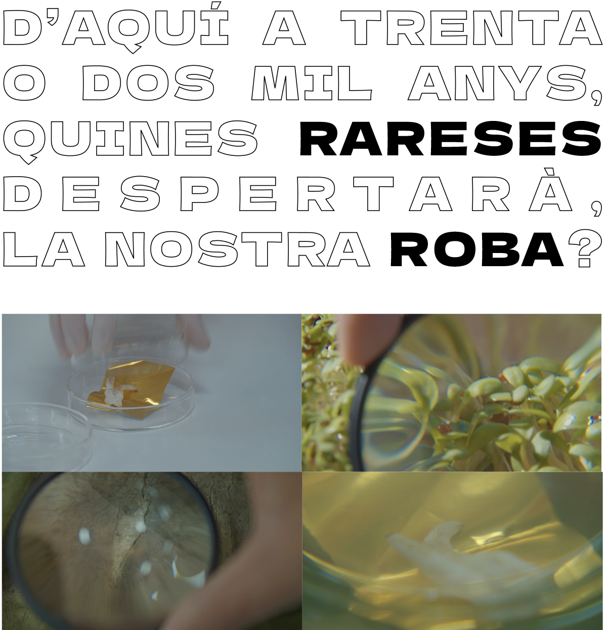CROP projecta aquesta estranyesa en el futur. Ens convida a contemplar les restes d’un món desconegut una vegada aquest món ja s’ha exhaurit, sigui perquè ha estat destruït o perquè s’ha florit, esdevenint d’aquesta manera ell mateix i altre en vides noves. L’estupefacció que això genera, la impossibilitat d’anomenar allò que és nou o que encara no ha arribat, és el «xoc de l’Antropocè» de què parla Alfredo González Ruibal, arqueòleg del Consell Superior d’Investigacions Científiques (CSIC).2 La raresa també pot ser intentar dir allò indicible, provar de llegir —literalment— les etiquetes malmeses d’allò que no es pot copsar amb facilitat.